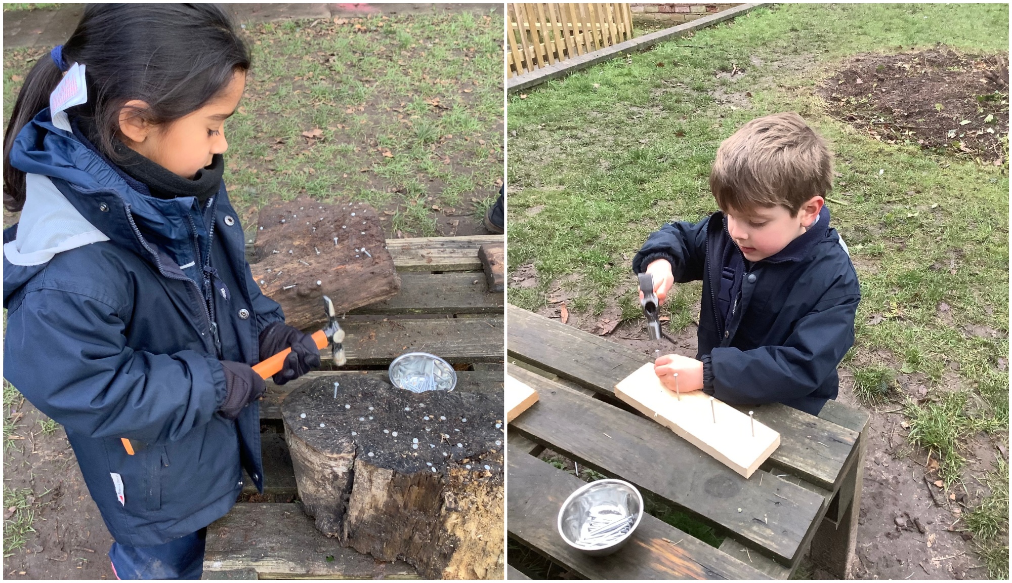 The Reception children have been developing new skills in Forest School, learning to peel sticks and hammer nails.