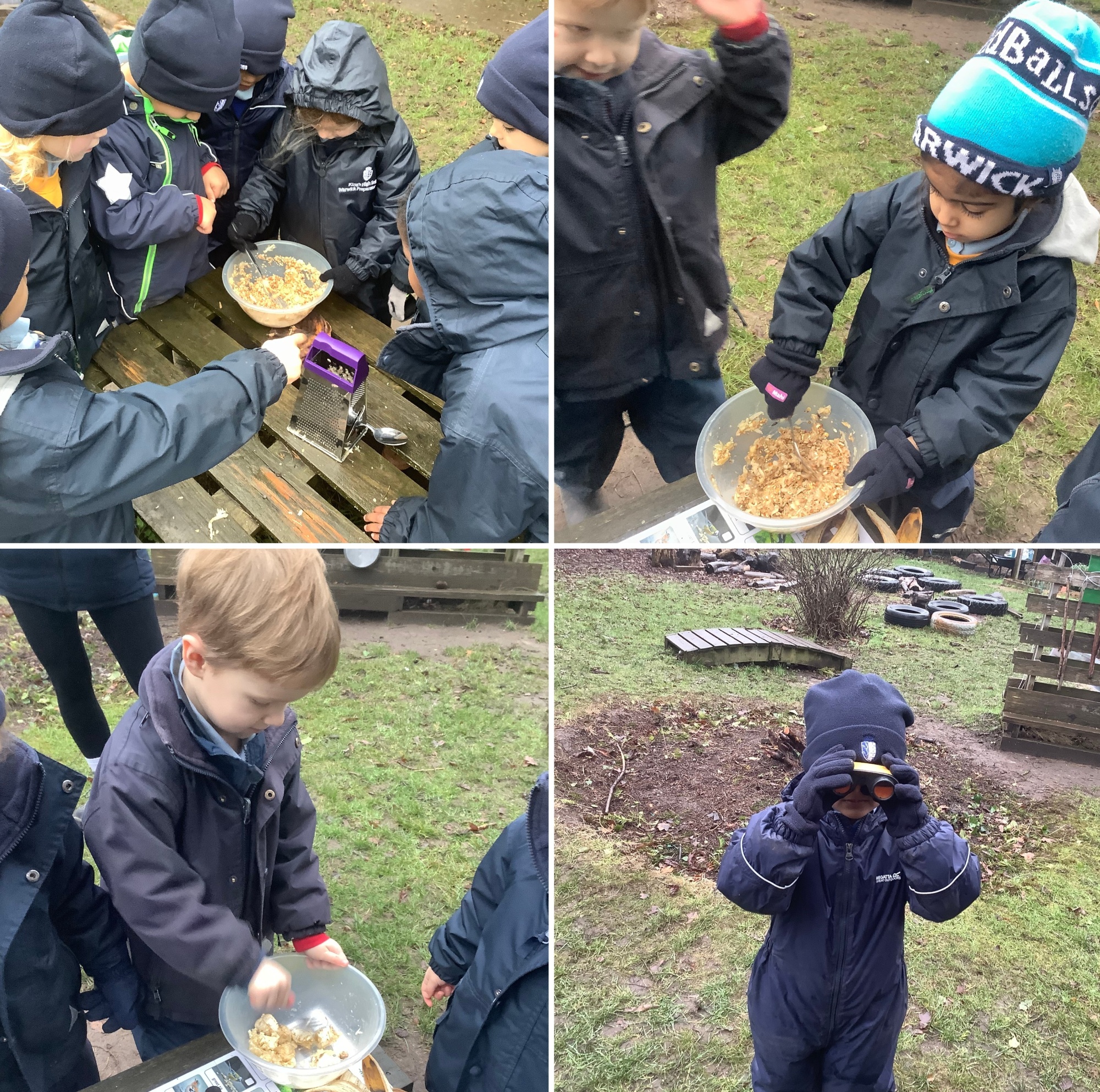 They made their own bird food using mashed bananas, grated apple and bread, mixed with bird seed. The food was placed into pieces of bark and hung in trees around the Forest School area.